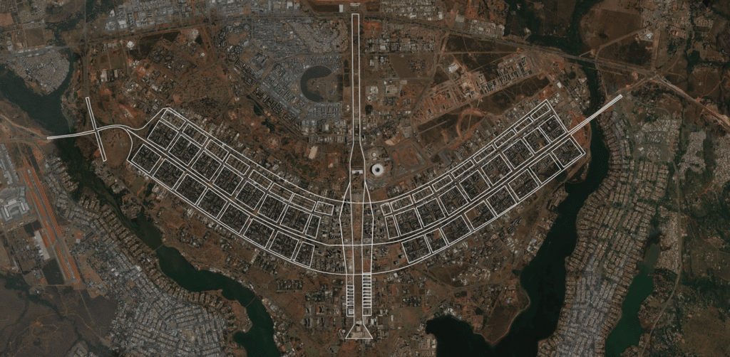 O formato que hoje lembra um avião surgiu da adaptação desse traçado à topografia do local e à evolução do próprio projeto. O eixo curvo — que deu origem às “asas” foi concebido para acompanhar a margem do Lago Paranoá e possibilitar uma melhor distribuição das superquadras residenciais.